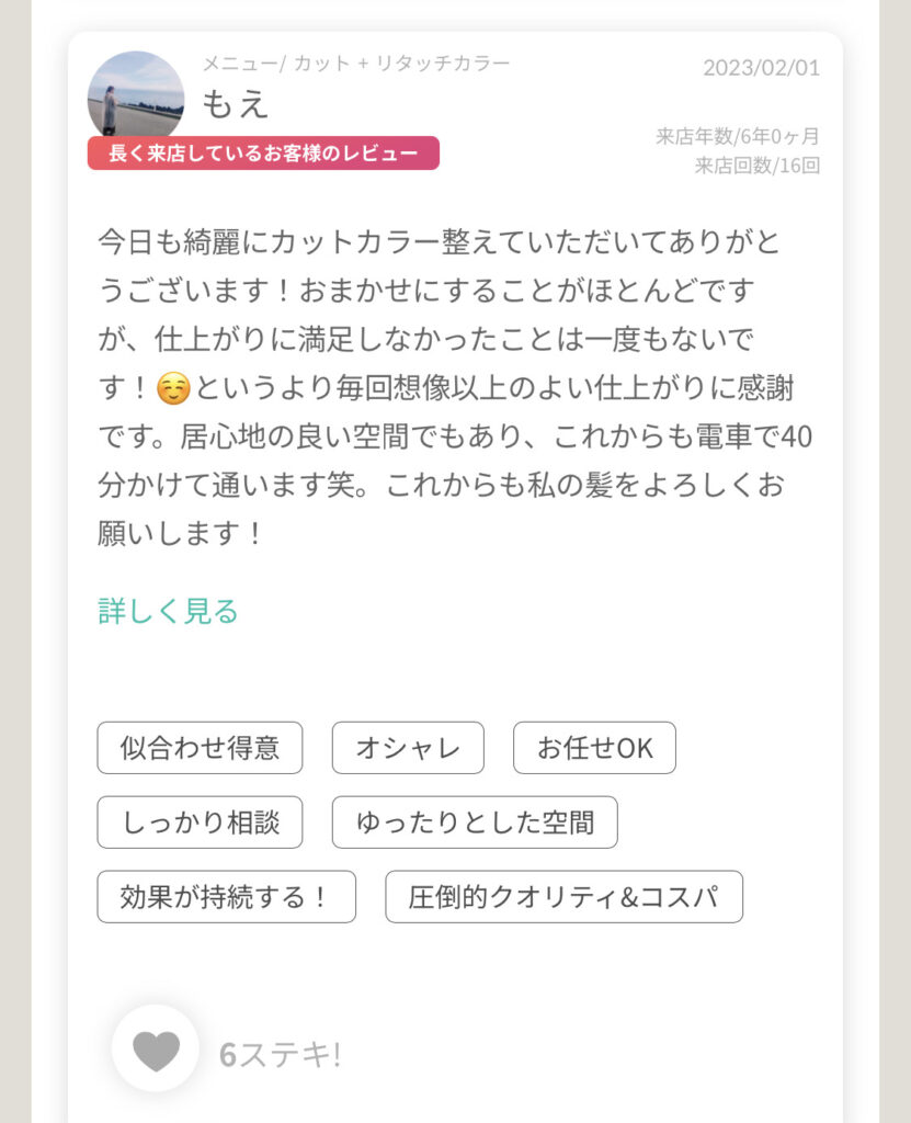 | こだわり条件 | 一人のスタイリストが仕上げまで担当/朝10時前でも受付OK/カード支払いOK | ||